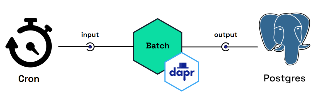 In this Quickstart, you schedule a batch script to run every 10 seconds using an input Cron binding. The script processes a JSON file and outputs data to a SQL database using the PostgreSQL Dapr binding.